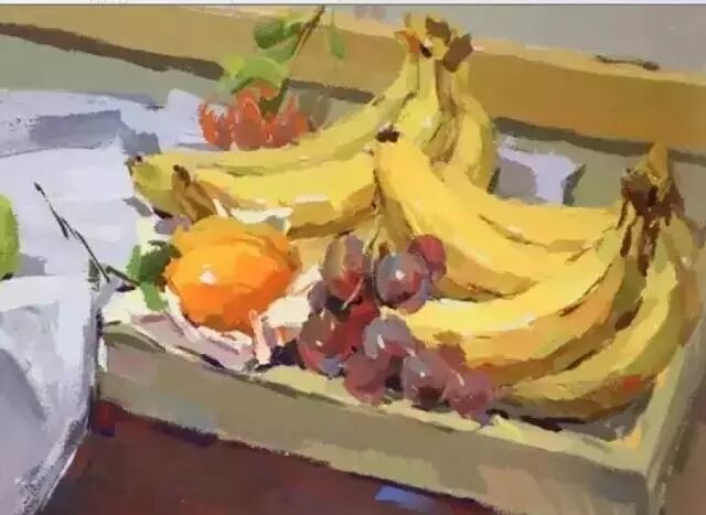 所以把握上图色调会刚刚好。型是香蕉本身的体面特征要画好,一般我们看到一根香蕉的三个面,注意其色彩明度纯度冷暖的变化与对比关系。