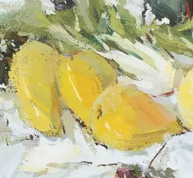 因为梨子的表面比苹果要粗糙,所以梨子的高光比苹果要弱些,用色主要以中黄、柠檬黄、土黄为主,暗部可加少量赭石与淡绿。